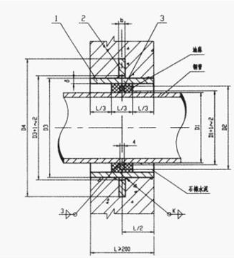 4 、套管穿墻處之墻壁,如遇非混凝土墻壁時應改用混凝土墻壁,其澆注混凝土范圍應比翼環直徑( D6 )大 200mm ,而且必須將套管澆固與墻內。